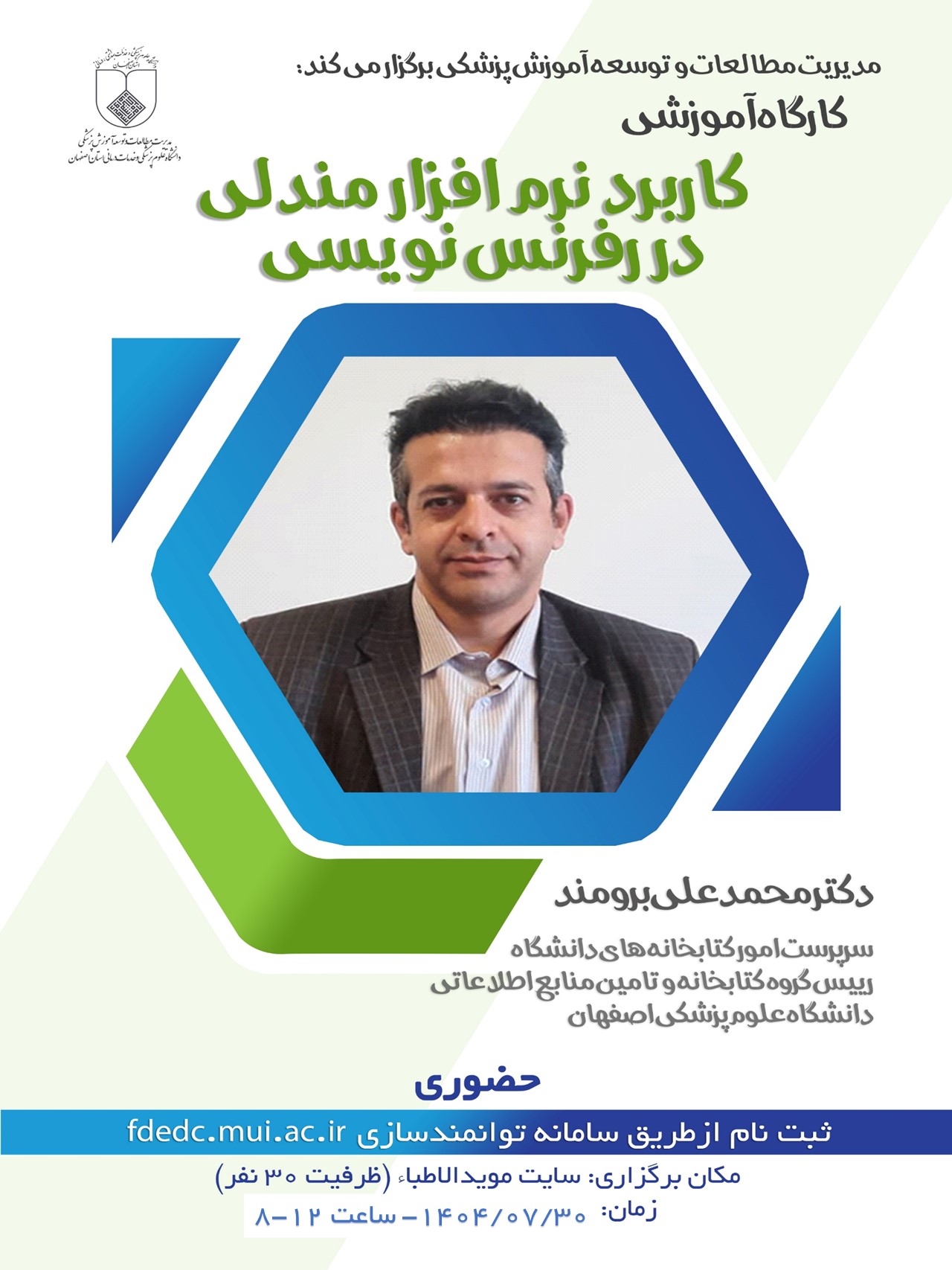 کارگاه آموزشی کاربرد نرم افزار مندلی در رفرنس نویسی کارگاه آموزشی کاربرد نرم افزار مندلی در رفرنس نویسیاستاد: دکتر برومندمکان: سایت موید الاطبازمان: 30 مهر ماه 1404- ساعت 8-12